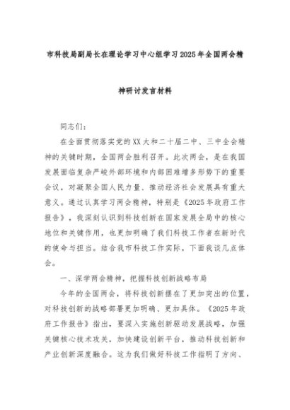 【七哥公文】2025年:市科技局副局长在理论学习中心组学习2025年全国两会精神研讨发言材料+更多免费公文+VX:QiGeGongWen2024