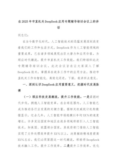 【七哥公文】2025年:在2025年市直机关DeepSeek应用专题辅导培训会议上的讲话+更多免费公文+VX:QiGeGongWen2024