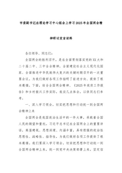 【七哥公文】2025年:市委副书记在理论学习中心组会上学习2025年全国两会精神研讨发言材料+更多免费公文+VX:QiGeGongWen2024