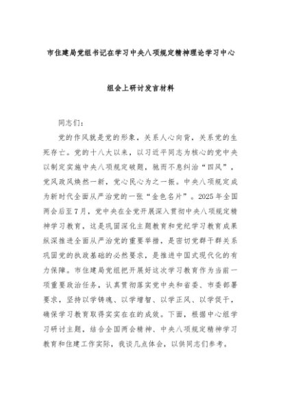 【七哥公文】2025年:市住建局党组书记在学习中央八项规定精神理论学习中心组会上研讨发言材料+更多免费公文+VX:QiGeGongWen2024