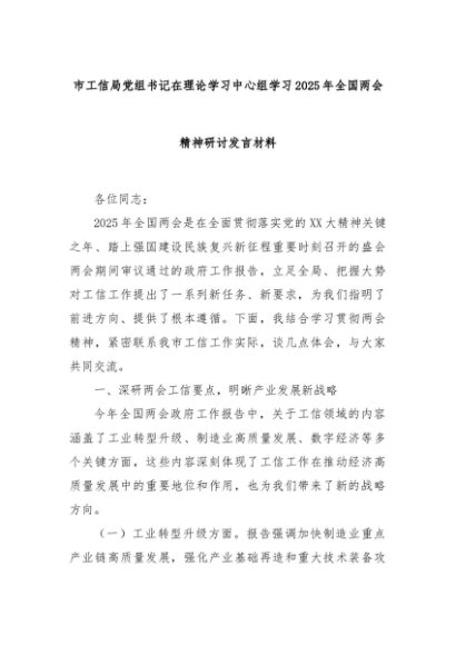 【七哥公文】2025年:市工信局党组书记在理论学习中心组学习2025年全国两会精神研讨发言材料+更多免费公文+VX:QiGeGongWen2024
