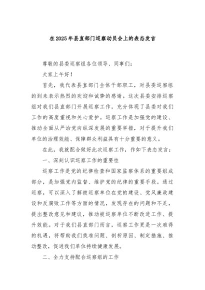 / 【七哥公文】2025年:在2025年县直部门巡察动员会上的表态发言+更多免费公文+VX:QiGeGongWen2024