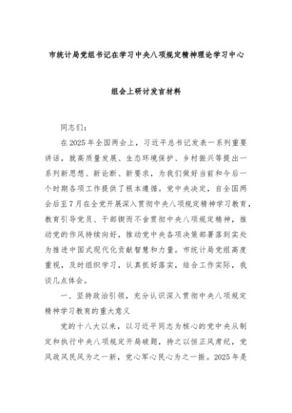 【七哥公文】2025年:市统计局党组书记在学习中央八项规定精神理论学习中心组会上研讨发言材料+更多免费公文+VX:QiGeGongWen2024