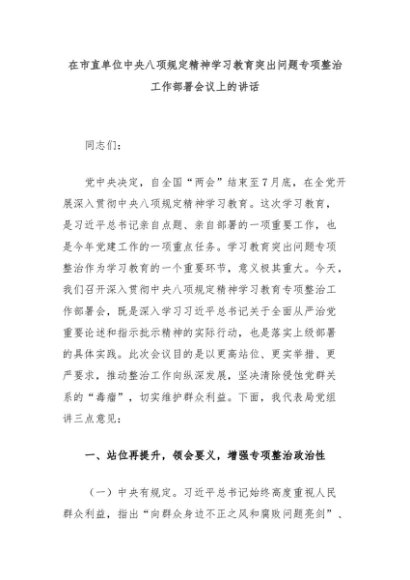 【七哥公文】2025年:在市直单位中央八项规定精神学习教育突出问题专项整治工作部署会议上的讲话+更多免费公文+VX:QiGeGongWen2024