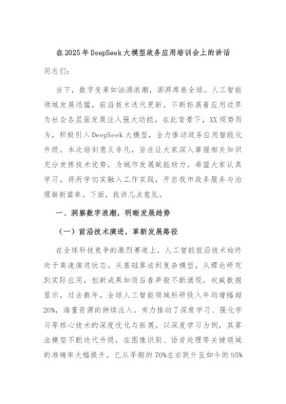 【七哥公文】2025年:在2025年DeepSeek大模型政务应用培训会上的讲话+更多免费公文+VX:QiGeGongWen2024
