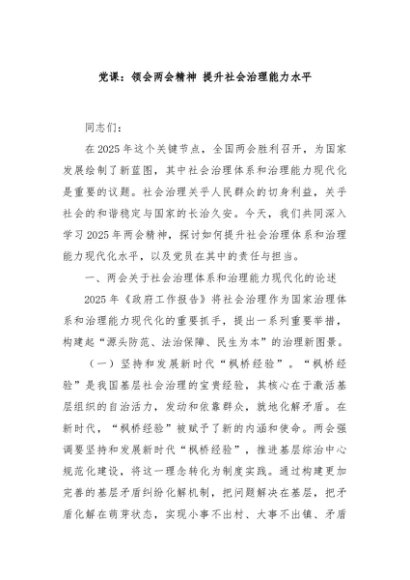 / 【七哥公文】2025年:党课:领会两会精神 提升社会治理能力水平+更多免费公文+VX:QiGeGongWen2024