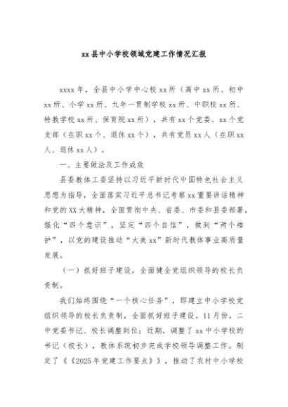 / 【七哥公文】2025年:xx县中小学校领域党建工作情况汇报+更多免费公文+VX:QiGeGongWen2024