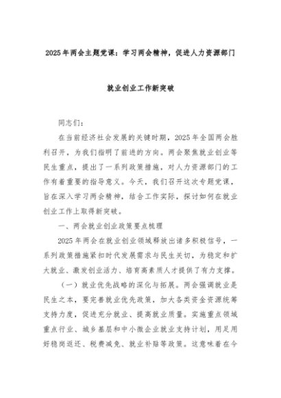 【七哥公文】2025年:2025年两会主题党课:学习两会精神,促进人力资源部门就业创业工作新突破+更多免费公文+VX:QiGeGongWen2024
