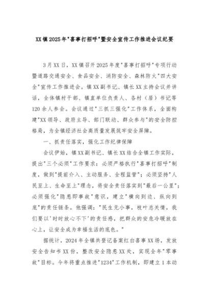 【七哥公文】2025年:XX镇2025年“喜事打招呼”暨安全宣传工作推进会议纪要+更多免费公文+VX:QiGeGongWen2024