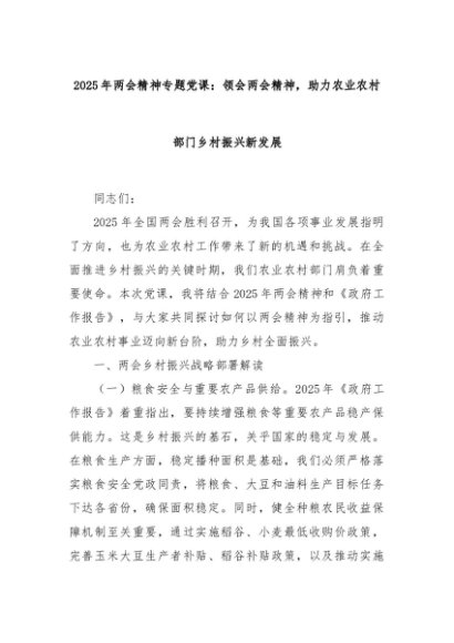 【七哥公文】2025年:2025年两会精神专题党课:领会两会精神,助力农业农村部门乡村振兴新发展+更多免费公文+VX:QiGeGongWen2024