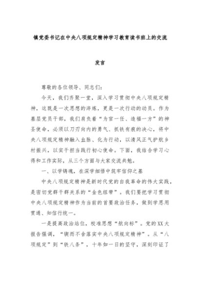 【七哥公文】2025年:镇党委书记在中央八项规定精神学习教育读书班上的交流发言+更多免费公文+VX:QiGeGongWen2024