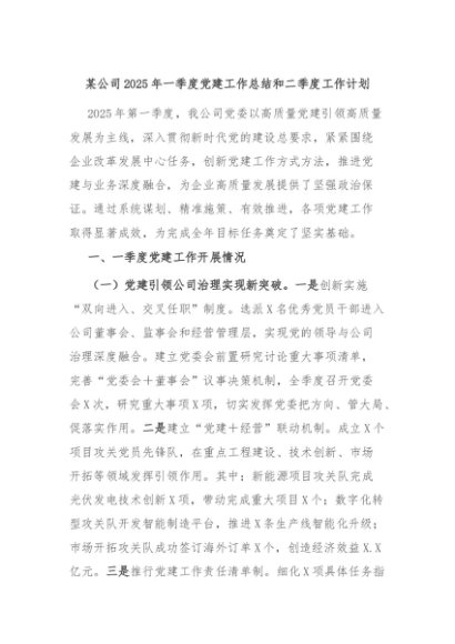 【七哥公文】2025年:某公司2025年一季度党建工作总结和二季度工作计划+更多免费公文+VX:QiGeGongWen2024