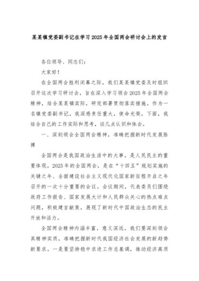【七哥公文】2025年:某某镇党委副书记在学习2025年全国两会研讨会上的发言+更多免费公文+VX:QiGeGongWen2024