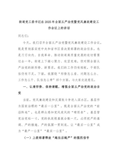 【七哥公文】2025年:街道党工委书记在2025年全面从严治党暨党风廉政建设工作会议上的讲话+更多免费公文+VX:QiGeGongWen2024