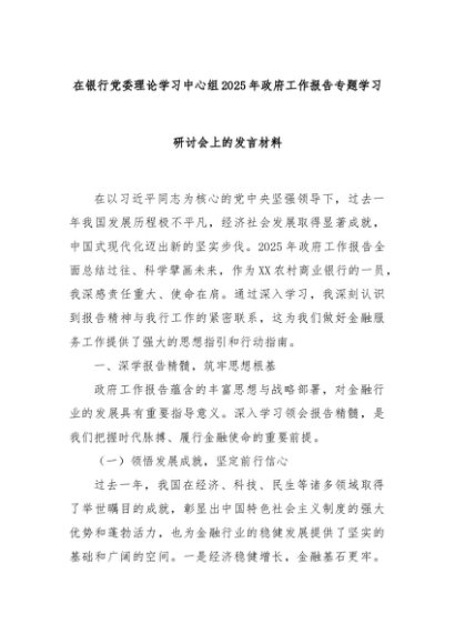 【七哥公文】2025年:在银行党委理论学习中心组2025年政府工作报告专题学习研讨会上的发言材料+更多免费公文+VX:QiGeGongWen2024