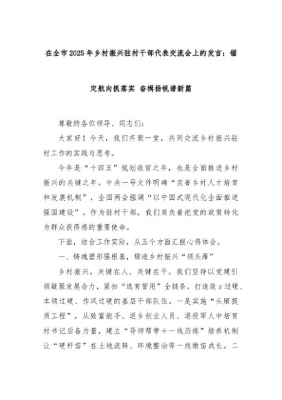【七哥公文】2025年:在全市2025年乡村振兴驻村干部代表交流会上的发言:锚定航向抓落实 奋楫扬帆谱新篇+更多免费公文+VX:QiGeGongWen2024