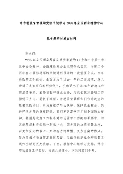 【七哥公文】2025年:市市场监督管理局党组书记学习2025年全国两会精神中心组专题研讨发言材料+更多免费公文+VX:QiGeGongWen2024