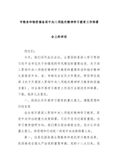 【七哥公文】2025年:市粮食和物资储备局中央八项规定精神学习教育工作部署会上的讲话+更多免费公文+VX:QiGeGongWen2024