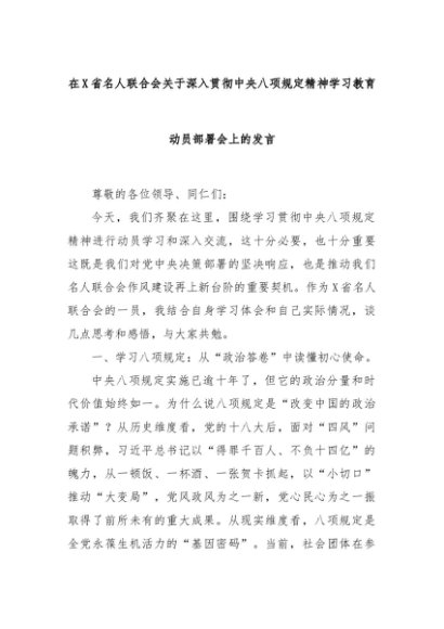 【七哥公文】2025年:在X省名人联合会关于深入贯彻中央八项规定精神学习教育动员部署会上的发言+更多免费公文+VX:QiGeGongWen2024