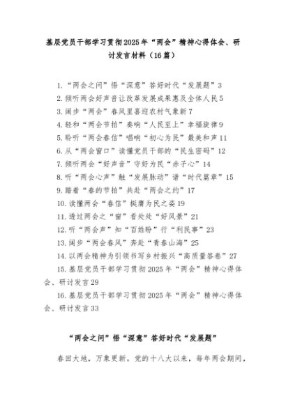 【七哥公文】2025年:(16篇)基层党员干部学习贯彻2025年全国两会精神心得体会、研讨发言材料+更多免费公文+VX:QiGeGongWen2024