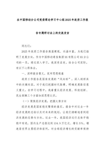 【七哥公文】2025年:在中国移动分公司党委理论学习中心组2025年政府工作报告专题研讨会上的交流发言+更多免费公文+VX:QiGeGongWen2024