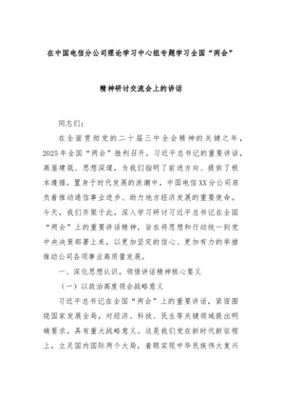 【七哥公文】2025年:在中国电信分公司理论学习中心组专题学习全国“两会”精神研讨交流会上的讲话+更多免费公文+VX:QiGeGongWen2024