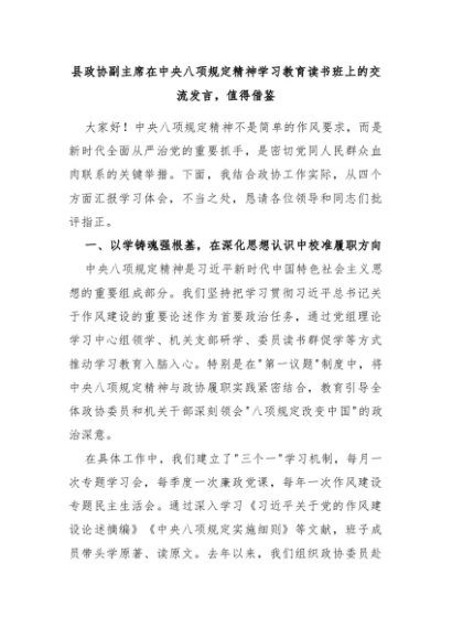【七哥公文】2025年:县政协副主席在中央八项规定精神学习教育读书班上的交流发言,值得借鉴+更多免费公文+VX:QiGeGongWen2024