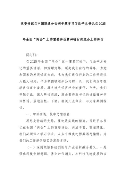 【七哥公文】2025年:党委书记在中国联通分公司专题学习习近平总书记在2025年全国“两会”上的重要讲话精神研讨交流会上的讲话+更多免费公文+VX:QiGeGongWen2024