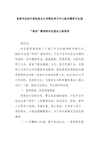 【七哥公文】2025年:党委书记在中国电信分公司理论学习中心组专题学习全国“两会”精神研讨交流会上的讲话+更多免费公文+VX:QiGeGongWen2024