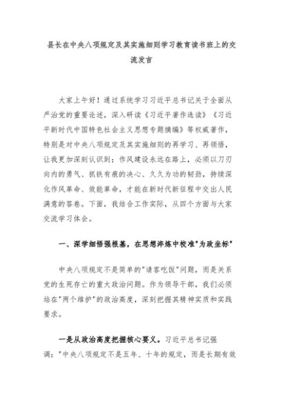 【七哥公文】2025年:县长在中央八项规定及其实施细则学习教育读书班上的交流发言+更多免费公文+VX:QiGeGongWen2024