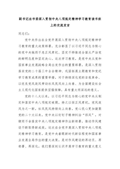【七哥公文】2025年:副书记在市委深入贯彻中央八项规定精神学习教育读书班上的交流发言+更多免费公文+VX:QiGeGongWen2024