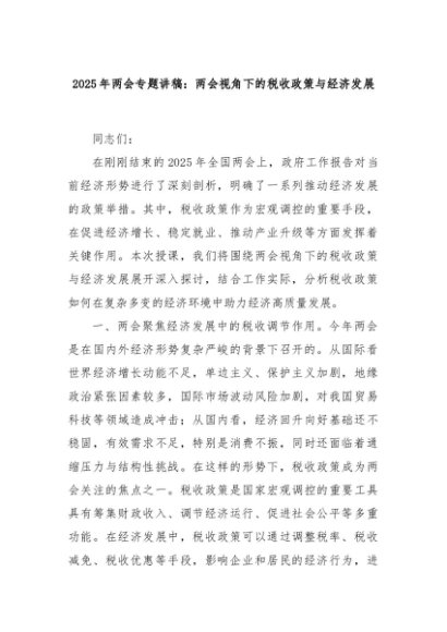 【七哥公文】2025年:2025年两会专题讲稿:两会视角下的税收政策与经济发展+更多免费公文+VX:QiGeGongWen2024