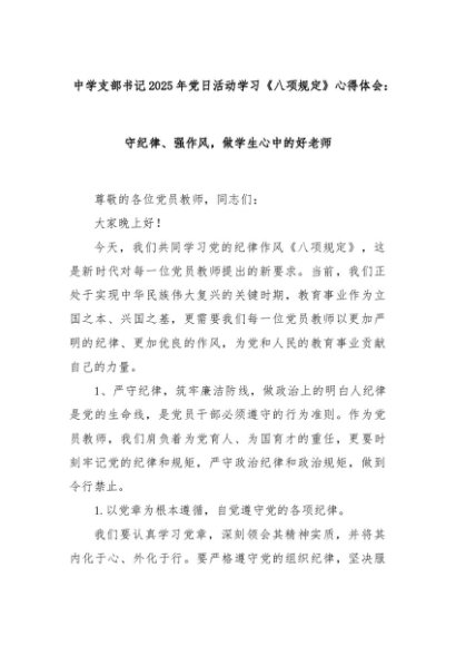 【七哥公文】2025年:中学支部书记2025年党日活动学习《八项规定》心得体会:守纪律、强作风,做学生心中的好老师+更多免费公文+VX:QiGeGongWen2024