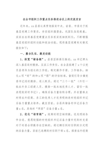 / 【七哥公文】2025年:在全市组织工作重点任务推进会议上的交流发言+更多免费公文+VX:QiGeGongWen2024
