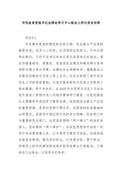 / 【七哥公文】2025年:市民政局党组书记在理论学习中心组会上研讨发言材料+更多免费公文+VX:QiGeGongWen2024