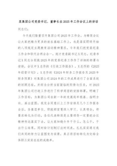 【七哥公文】2025年:某集团公司党委书记、董事长在2025年工作会议上的讲话+更多免费公文+VX:QiGeGongWen2024