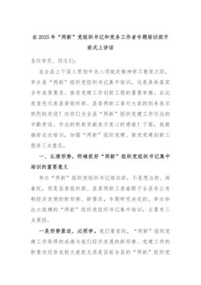 【七哥公文】2025年:在2025年“两新”党组织书记和党务工作者专题培训班开班式上讲话+更多免费公文+VX:QiGeGongWen2024