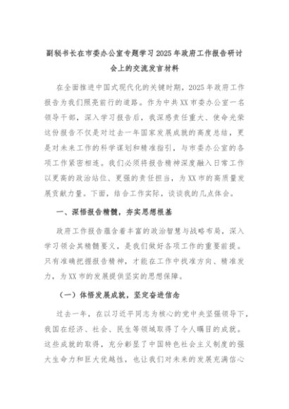 【七哥公文】2025年:副秘书长在市委办公室专题学习2025年政府工作报告研讨会上的交流发言材料+更多免费公文+VX:QiGeGongWen2024