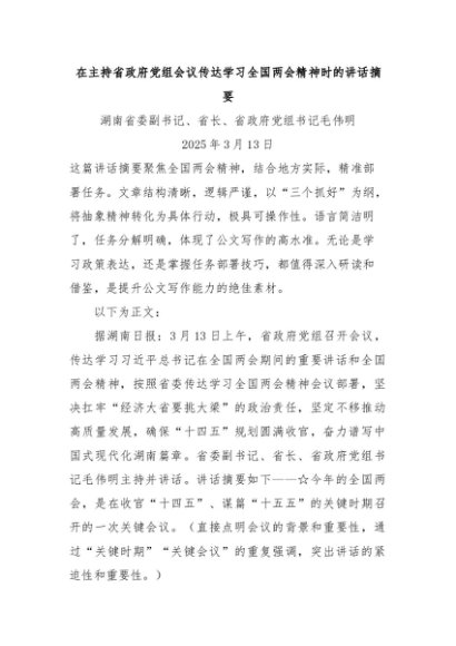 【七哥公文】2025年:在主持省政府党组会议传达学习全国两会精神时的讲话摘要+更多免费公文+VX:QiGeGongWen2024