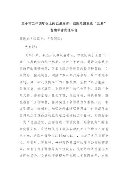 【七哥公文】2025年:在全市工作调度会上的汇报发言:创新思路狠抓“三基”构建和谐交通环境+更多免费公文+VX:QiGeGongWen2024