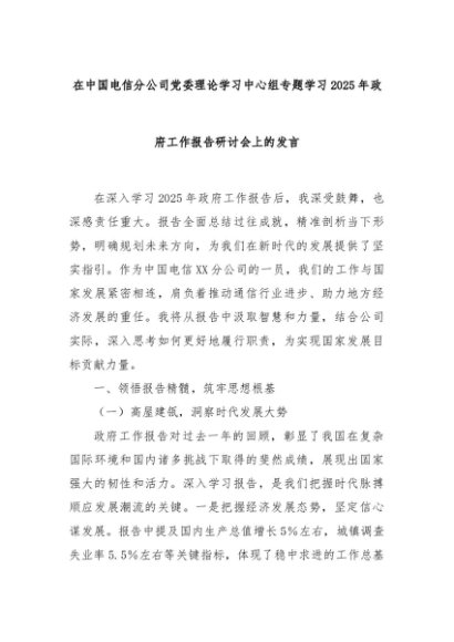 【七哥公文】2025年:在中国电信分公司党委理论学习中心组专题学习2025年政府工作报告研讨会上的发言+更多免费公文+VX:QiGeGongWen2024