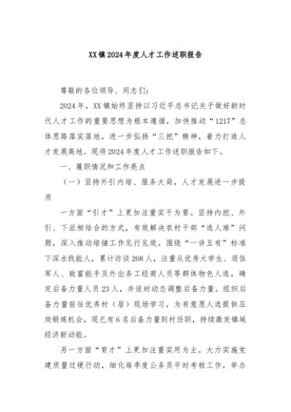/ 【七哥公文】2025年:XX镇2024年度人才工作述职报告+更多免费公文+VX:QiGeGongWen2024
