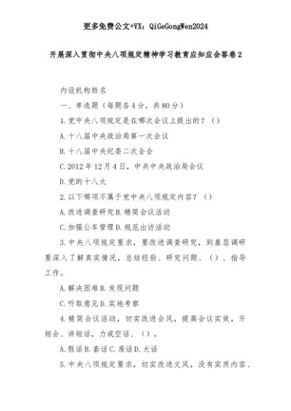 【七哥公文】2025年:开展深入贯彻中央八项规定精神学习教育应知应会答卷2+更多免费公文+VX:QiGeGongWen2024+更多免费公文+VX:QiGeGongWen2024