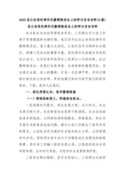 【七哥公文】2025年:(2篇)2025县公安局纪律作风整顿推进会上的研讨发言材料+更多免费公文+VX:QiGeGongWen2024