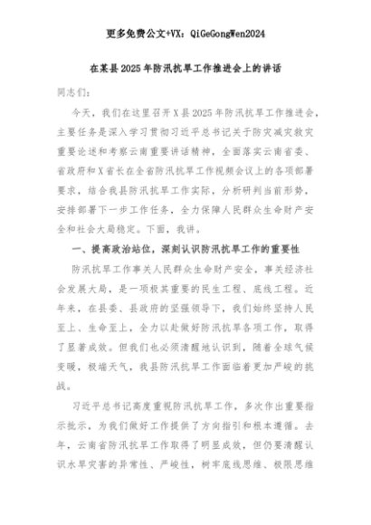 【七哥公文】2025年:在某县2025年防汛抗旱工作推进会上的讲话+更多免费公文+VX:QiGeGongWen2024+更多免费公文+VX:QiGeGongWen2024