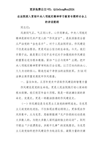【七哥公文】2025年:在法院深入贯彻中央八项规定精神学习教育专题研讨会上的讲话提纲+更多免费公文+VX:QiGeGongWen2024+更多免费公文+VX:QiGeGongWen2024