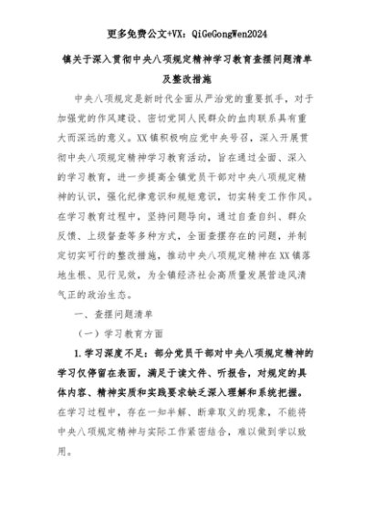 【七哥公文】2025年:镇关于深入贯彻中央八项规定精神学习教育查摆问题清单及整改措施+更多免费公文+VX:QiGeGongWen2024+更多免费公文+VX:QiGeGongWen2024