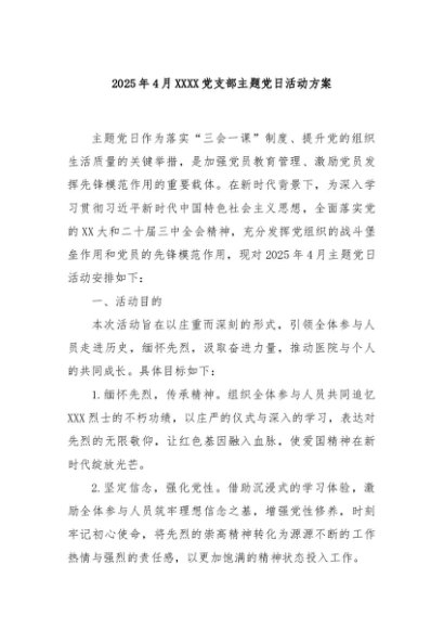 / 【七哥公文】2025年:2025年4月XXXX党支部主题党日活动方案+更多免费公文+VX:QiGeGongWen2024