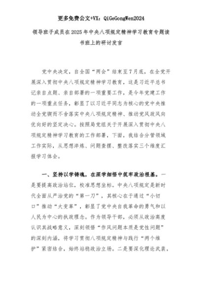 【七哥公文】2025年:领导班子成员在2025年中央八项规定精神学习教育专题读书班上的研讨发言+更多免费公文+VX:QiGeGongWen2024+更多免费公文+VX:QiGeGongWen2024
