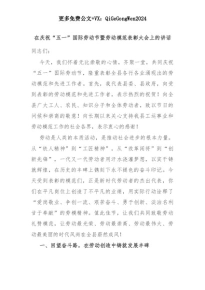 【七哥公文】2025年:在庆祝“五一”国际劳动节暨劳动模范表彰大会上的讲话+更多免费公文+VX:QiGeGongWen2024+更多免费公文+VX:QiGeGongWen2024